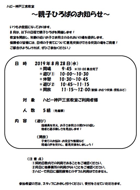 【神戸三宮】『親子ひろば』のお知らせ(8月28日)