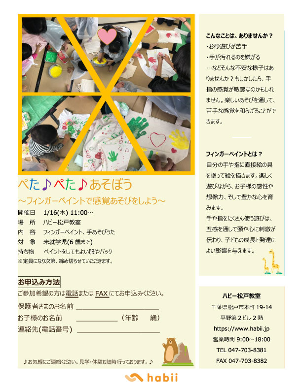 【松戸】無料親子イベント『ペタ♪ペタ♪あそぼう~フィンガーペイントで感覚あそびをしよう~』のお知らせ(1/16)