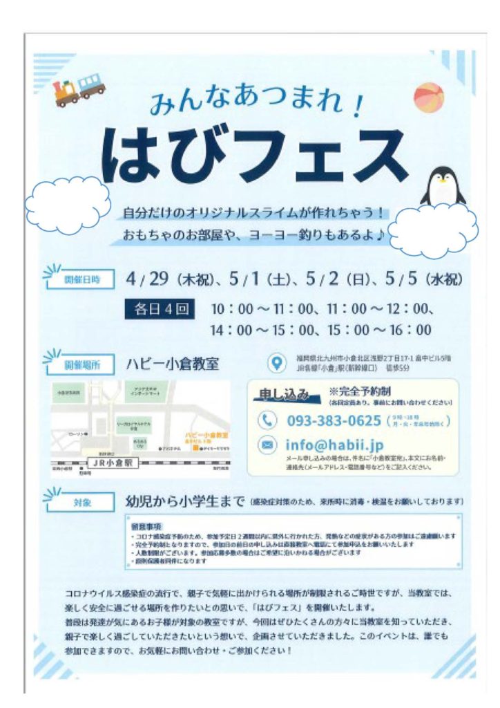 今回、ハビー小倉教室は、GWイベントとして💦はびフェス💦を開催します!