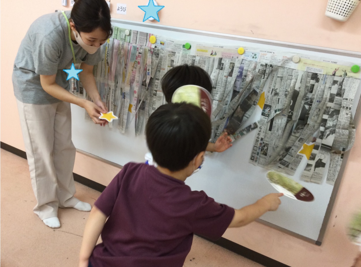その他にも天の川を曇らせる新聞紙の雲を吹き飛ばして織姫と彦星を見つけ出したり、雲の消えた天の川で星釣りをしたり、みんなで楽しく遊びました。