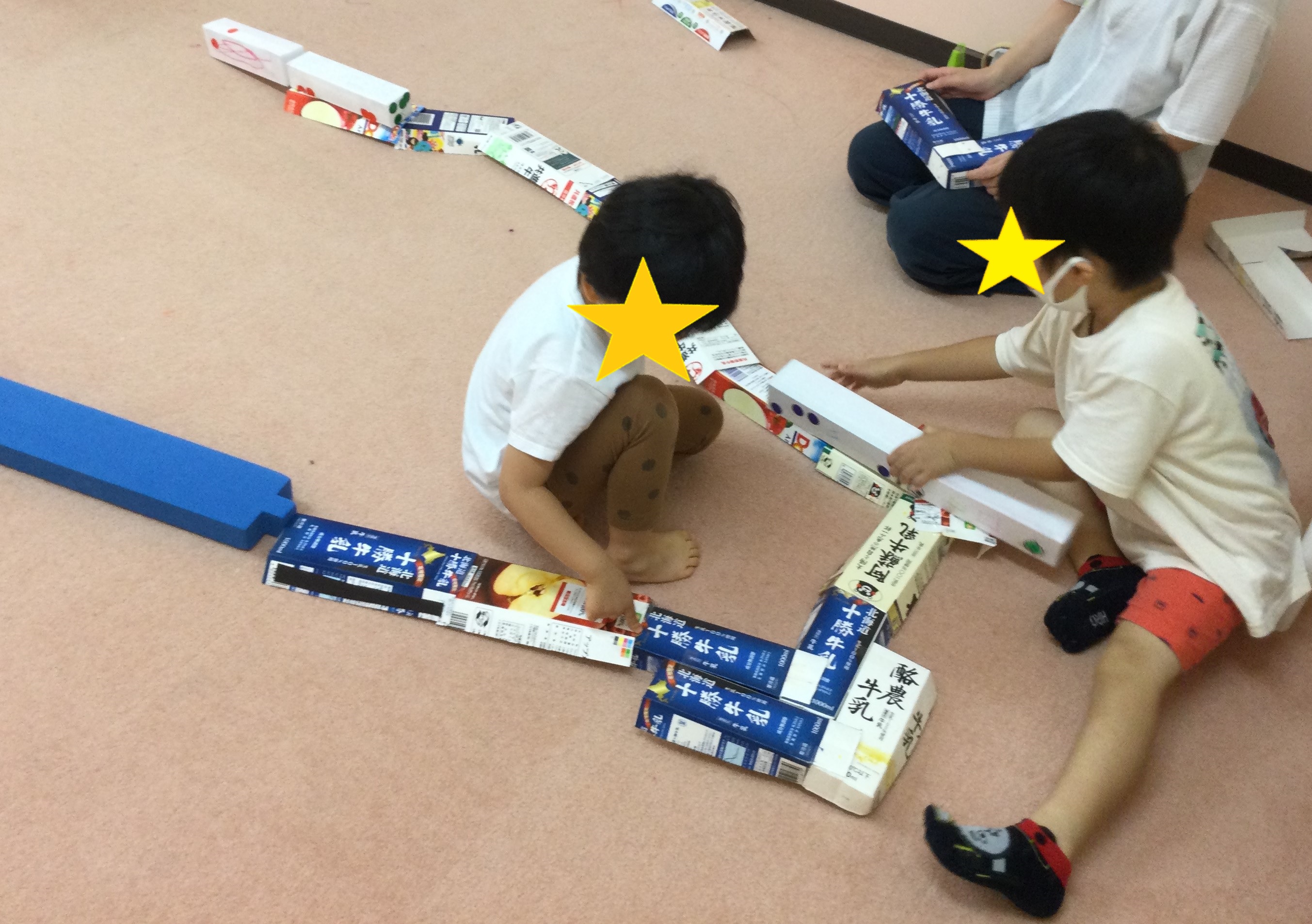 乗り物クイズのあと、みんなで牛乳パックを使って電車を作りました🚃