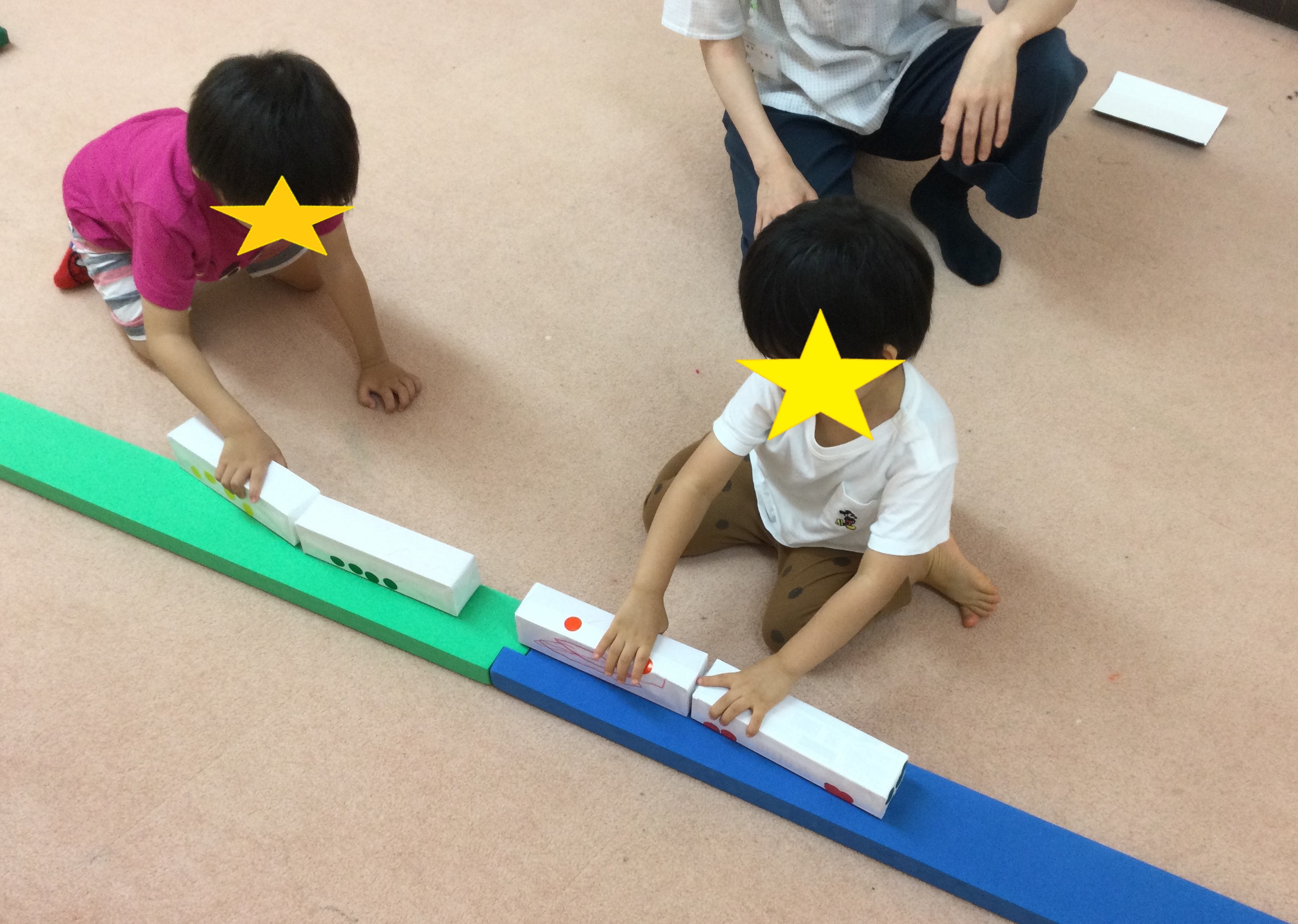 1人2個ずつ作ってマジックテープで連結!平均台や牛乳パックの線路を走らせたり、マットのお山⛰を上り下りさせて遊びました。