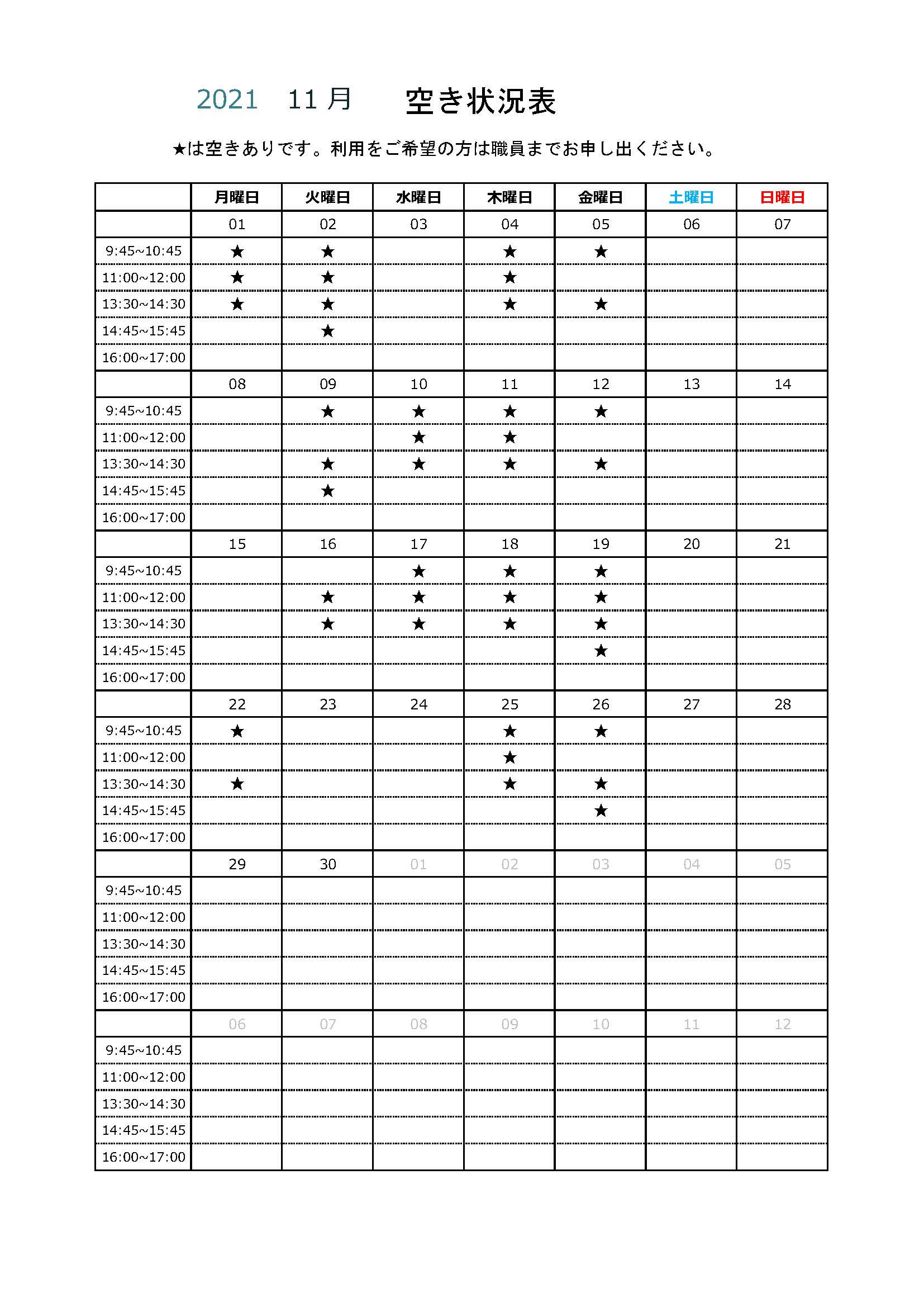 いつもの利用時間から変更した場合や、追加でご利用になりたい場合はお気軽にお声掛け下さい。その際既に埋まっていたり空き時間が変更になっている場合はご了承下さい。