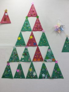 また、見上げると年長さんが頑張って作った立体的で可愛いクリスマスツリーが綺麗に飾られています🎅