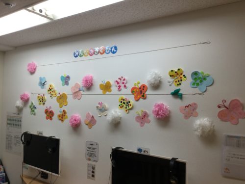 シールや折り紙を貼って、かわいいちょうちょがたくさん飛んでいます☀