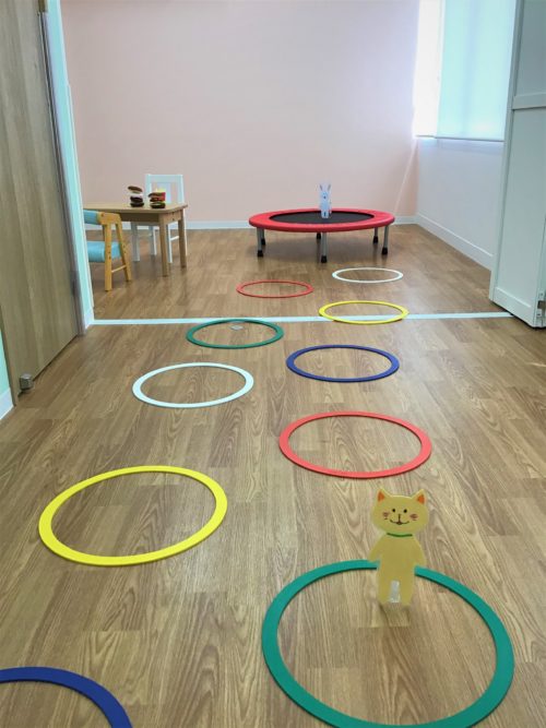 主にトランポリンやステップリング、平均台などを使用した粗大運動や集団支援で使用されます。