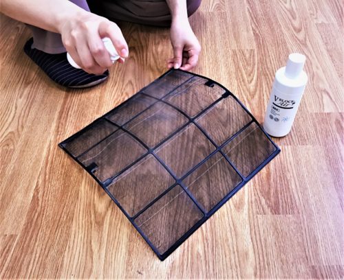 この製品をエアコンのフィルターに噴射して使用することで空間の抗菌・除菌を行っています。