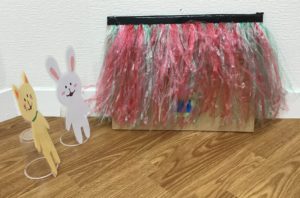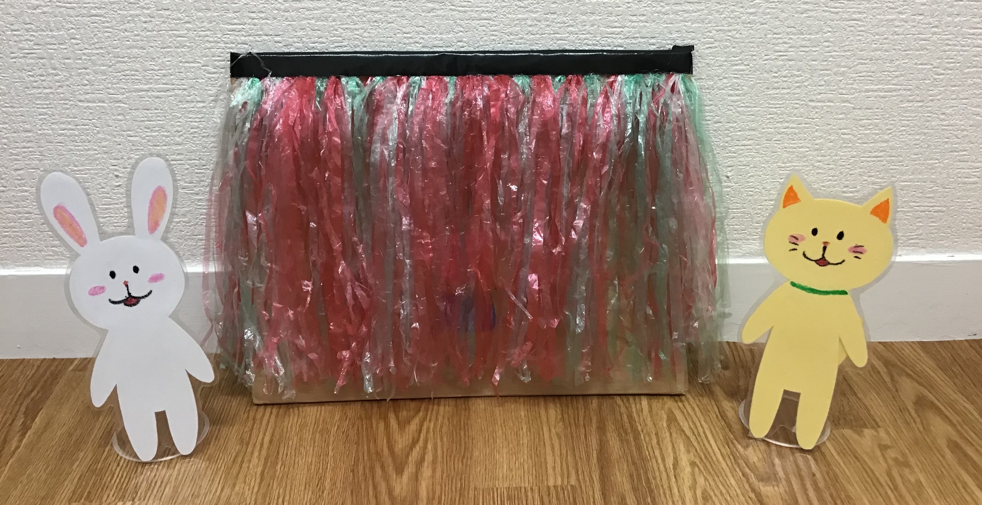 板状の段ボールに引き裂いたスズランテープをカーテンのように取り付けています。