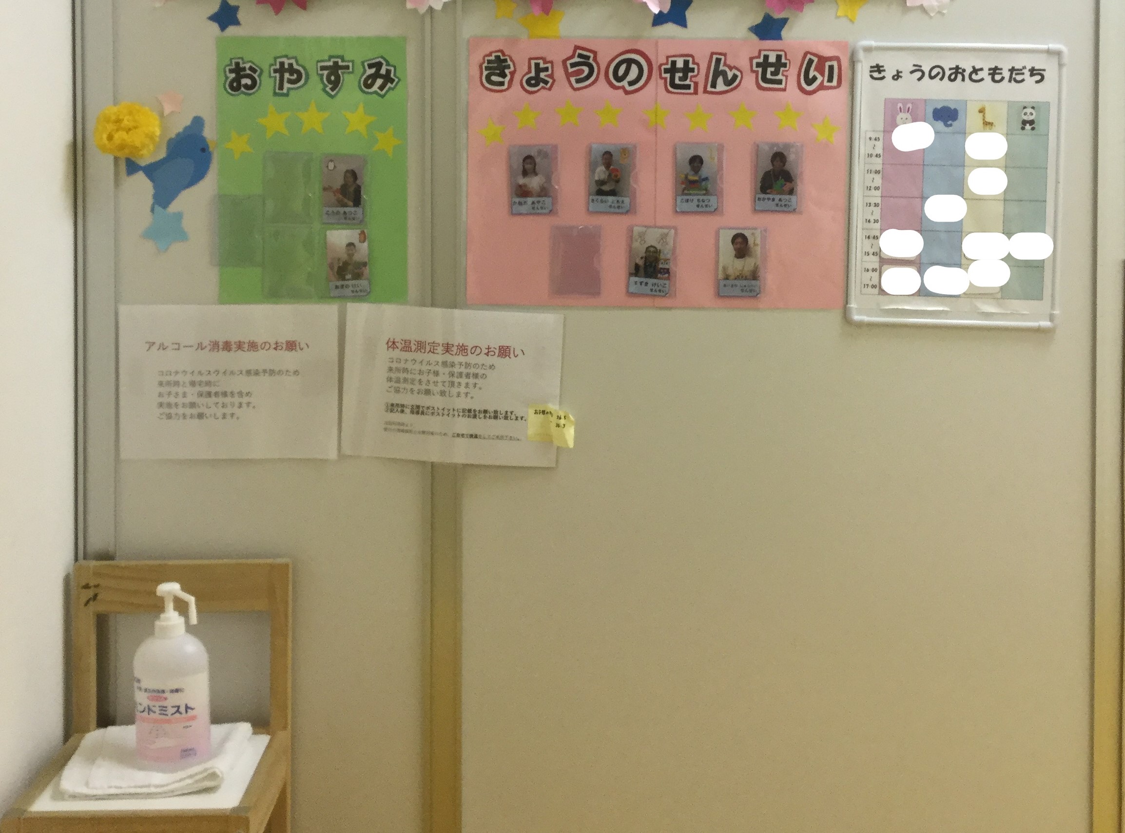 ドアを開けると、今日いる指導員や、来所予定の子どもたちの名前と今日の部屋が掲示されています。