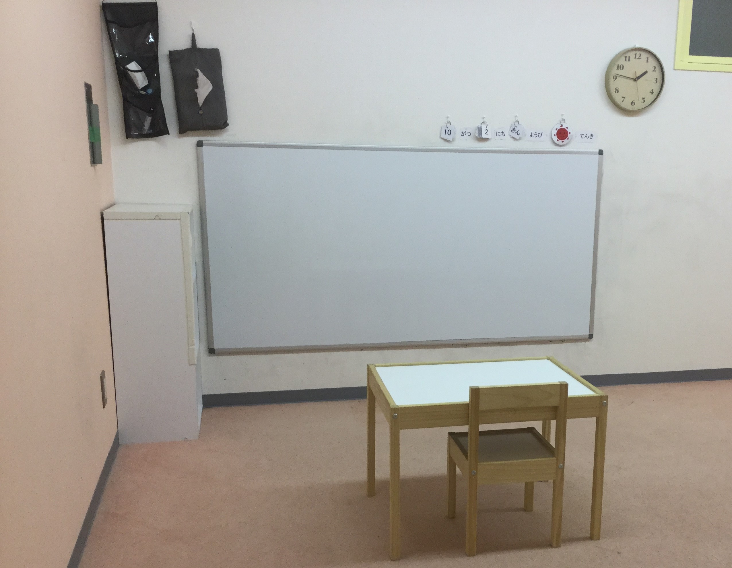 各部屋はそれぞれ少し違うところもありますが、ホワイトボードと机といす、時計、日付カードなどが設置されています。