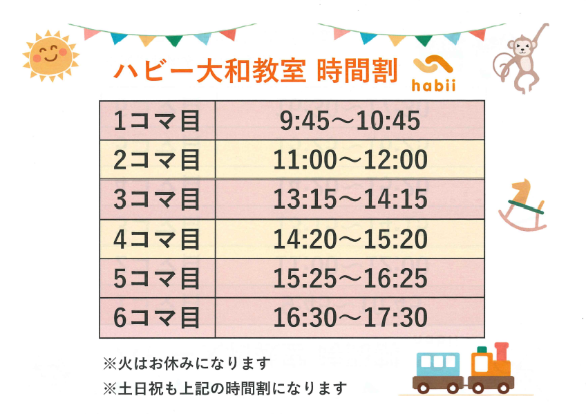 2つ目は2020年9月に開所しましたハビー大和教室ですが、6月からは月曜日も開所することになりました‼︎ 月曜日へ利用日の変更を希望される方は、お早めに職員までお声がけください。