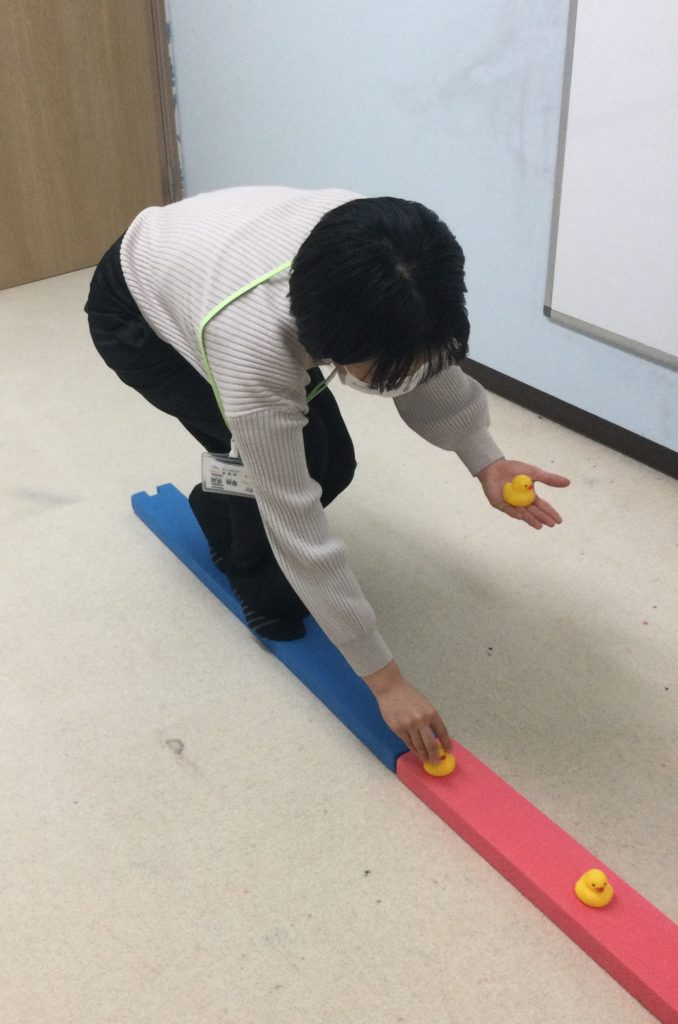 今回は平均台に置かれた玩具を拾いながら平均台を渡ります。