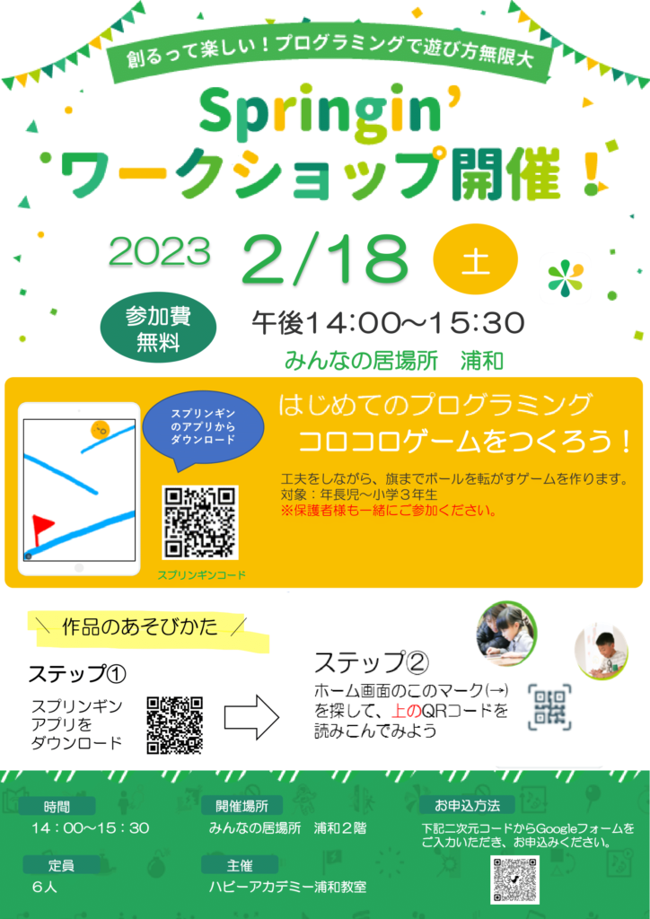 ハビーアカデミー教室のプログラミングコースでは、「Springin’Classroom(スプリンギンクラスルーム)」というビジュアルプログラミングアプリを教材として使用しており、毎月ワークショップを行っています。