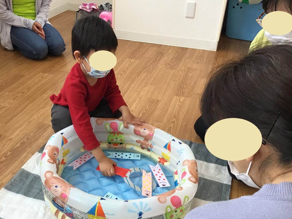 スペシャルメニューの「鯉のぼりすくいゲーム」では、水を張ったミニプールから鯉のぼりをすくい上げ、すくった鯉のぼりを紐に吊るして飾りを作りました。