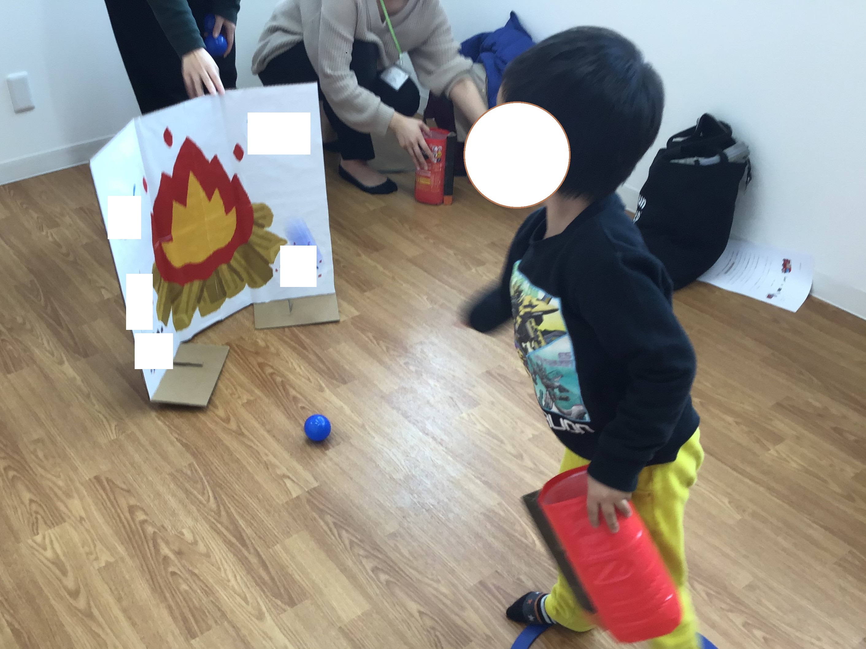 お水代わりの青いボールを火のパネルに力いっぱい当てて、パネルを倒したら消火成功です!