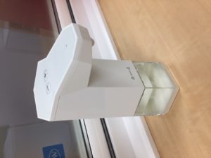 玄関、洗面所、職員室にタッチレスアルコールディスペンサーを設置し、こまめに手指の消毒を行えるようにしています。