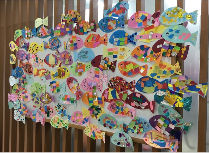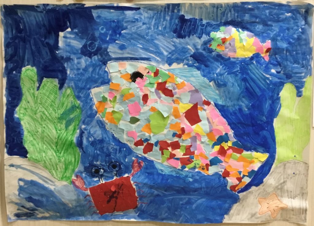 好きな色の画用紙をちぎって貼っていく中で、目の色は「黒にしよう」「水色でもいいね」とお友達に話し掛けながらみんなで協力して、大きな魚🐠を表現することができました。絵の具も「僕はここ塗ろう」等、声を掛け合いながら楽しく綺麗な海を表現してくれました。