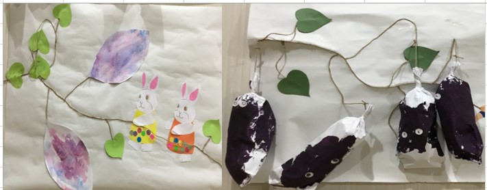 あらかじめ作っておいた画用紙で作った袋の中に、子ども達が新聞紙を丸めて入れていき、それに絵の具で色を付け、最後に目のシールを貼ってさつまいもを完成させました。
