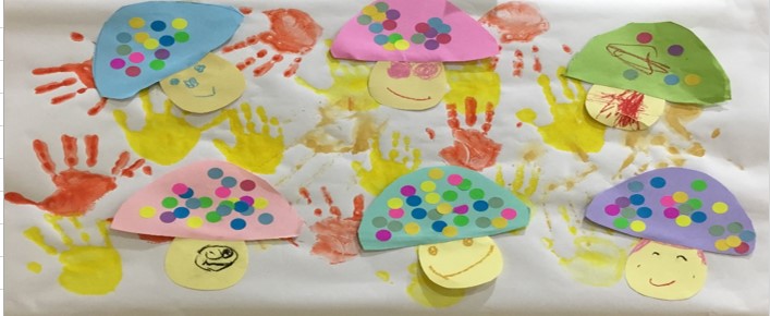 また、手形スタンプを行い、落ち葉をイメージした所にできたきのこを貼って完成させました。(*’▽’)