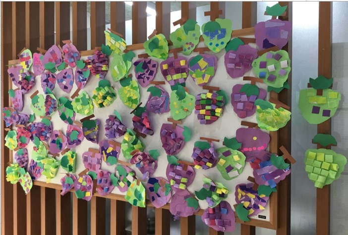 年少やプレの子ども達は、自分で折り紙を選び、手でちぎったり、丸シールを使ったりしてぶどうの実を表現しました(^▽^)/