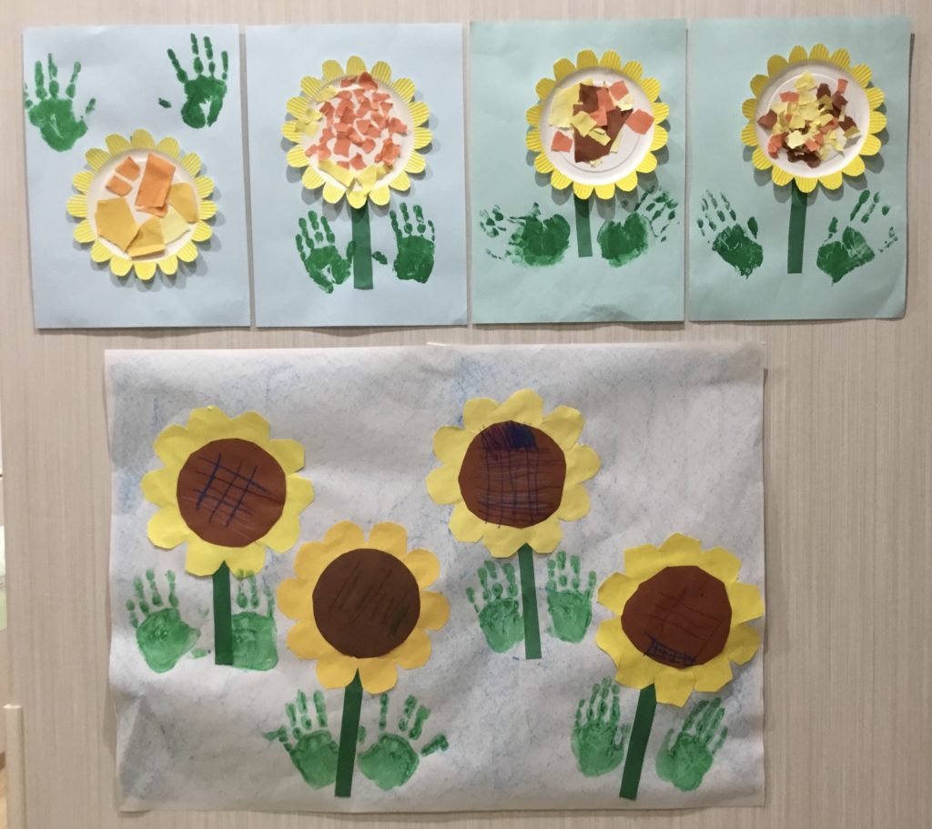 画用紙を好きな大きさにちぎり紙皿に貼ったり、画用紙を形に沿って切り、中に模様を描いたりと上手にお花🌼の部分を完成させることができました。葉っぱ🍃の部分の手形は「くすぐったいよ」や「僕は大丈夫」等、筆が触れた時に感じたことを伝え合いながら取り組むことができました。