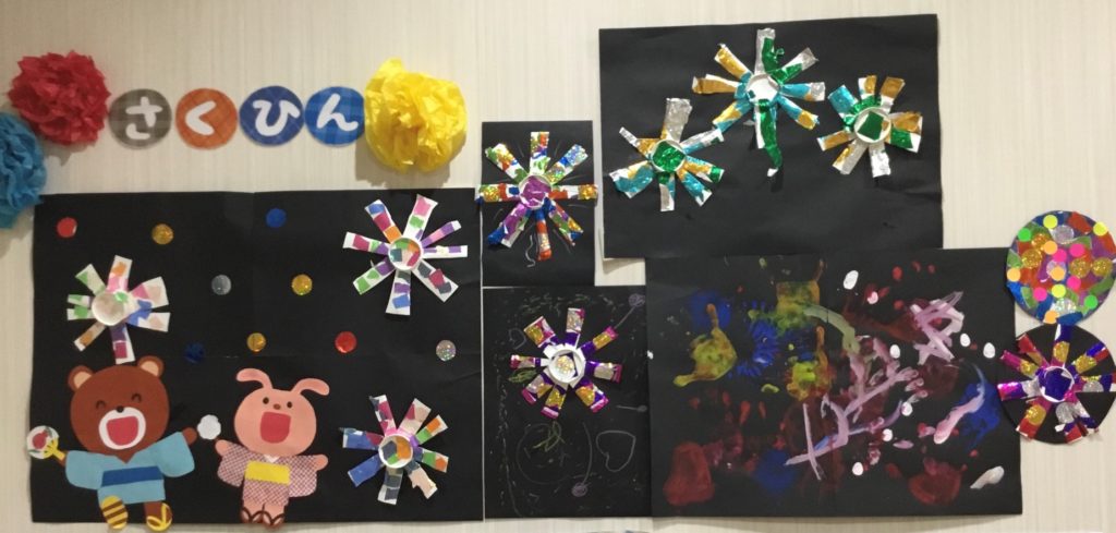 とてもきれいな花火が完成し、作っていない子どもも来所すると見に行く姿が見られるので、少しでも季節を感じることができる製作を行えてよかったな~と思いました