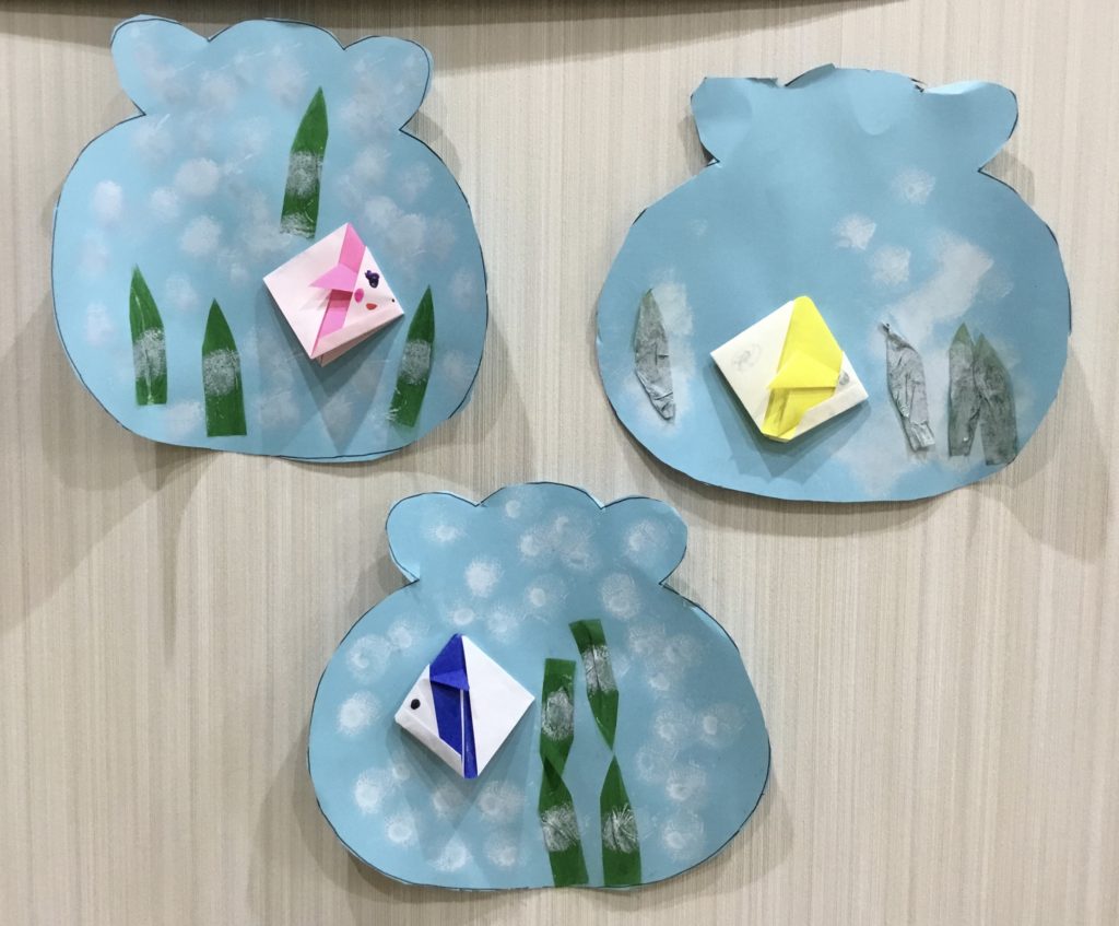 折り紙は兜を作る方法で折り進めていき、そこから金魚の形に変える作り方で折りました。兜の形から金魚の形に変える際に「へんしーん」と言ったり、みんなで楽しく折ることができました。ワカメを貼った後に絵の具のスタンプで気泡を描き、水の中の綺麗なイメージを表現することができました。