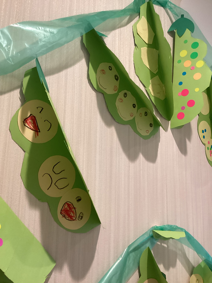 お豆にはかわいいお顔や好きな模様、さやにも飾りをつけてとってもカラフルに仕上がりました。