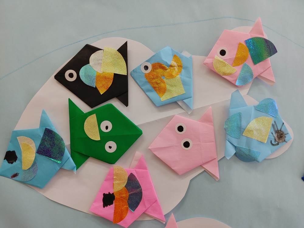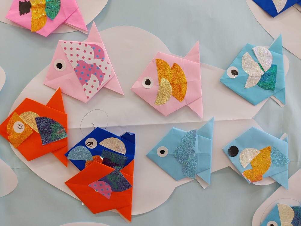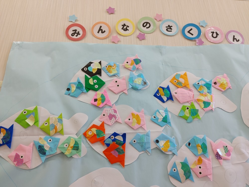 本日の本題は、折り紙を釣って皆に魚を作ってもらいました。