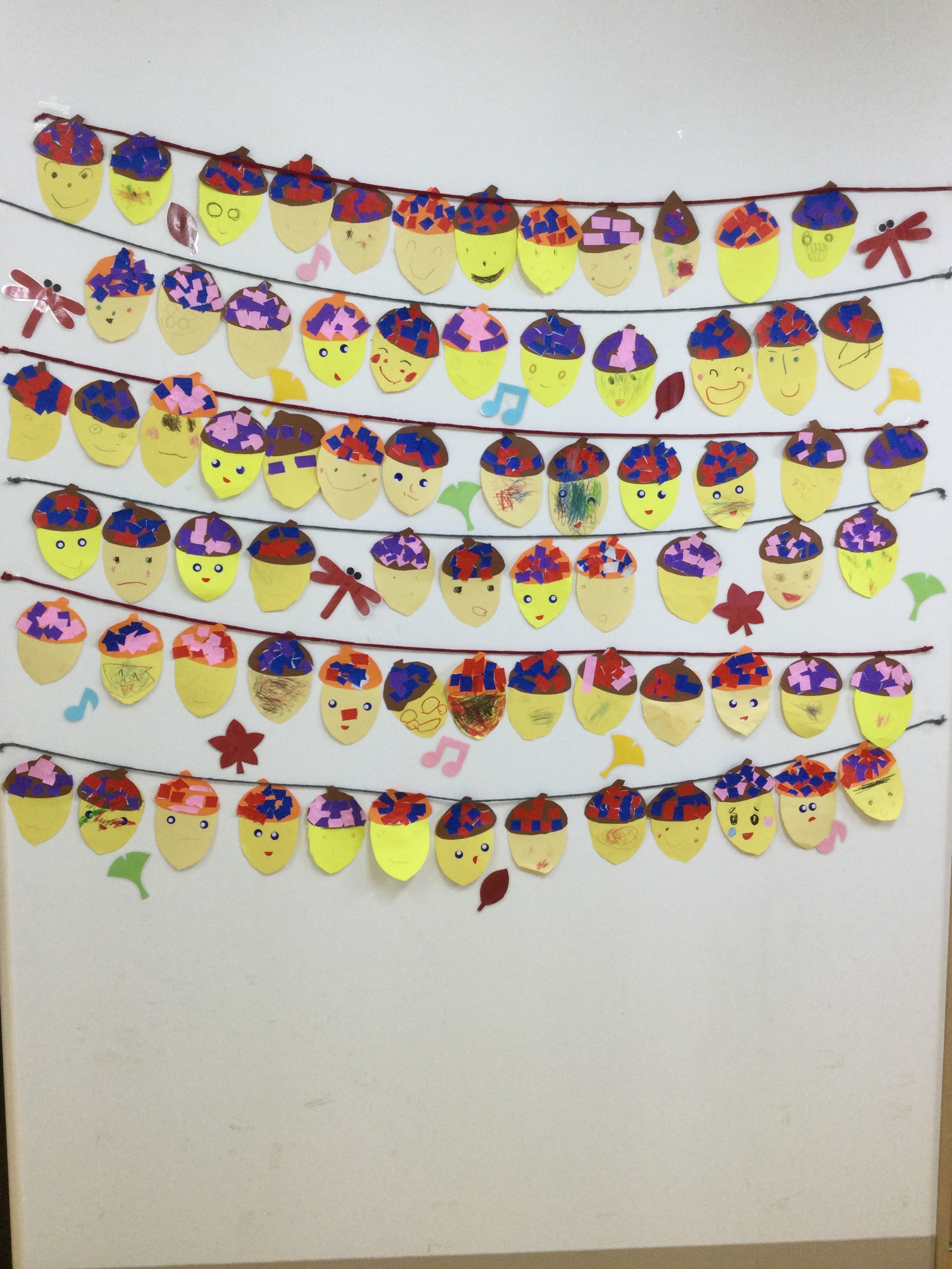 最後に目や口をクーピーで描いたり、シールを貼ったりして、可愛いどんぐりが完成✨