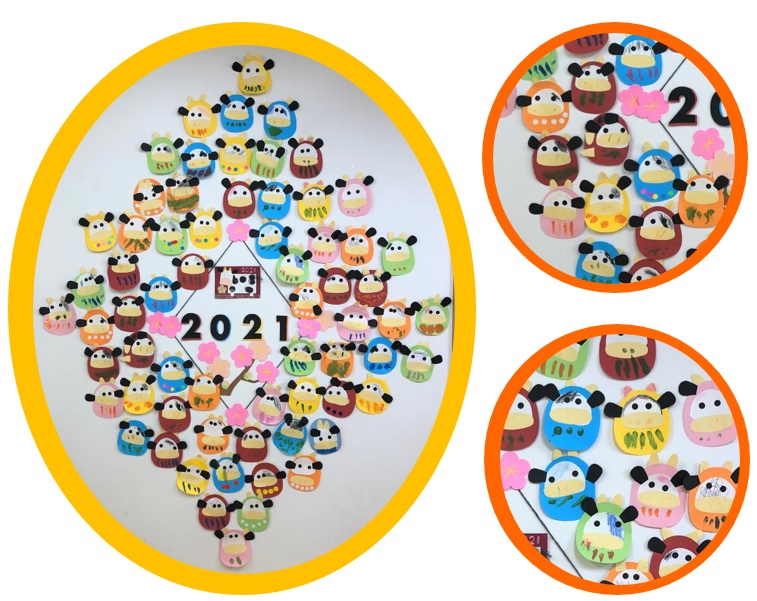 お子さま達のようにみんな違ったかわいい牛だるまの完成です。お子さま達の作品のおかげで華やかな2021年のスタートをきることができました。