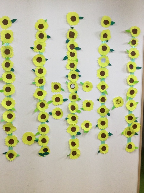 暑い毎日が続いていますが、そんな暑さを吹き飛ばす、ひまわり畑を教室の壁に再現しました。