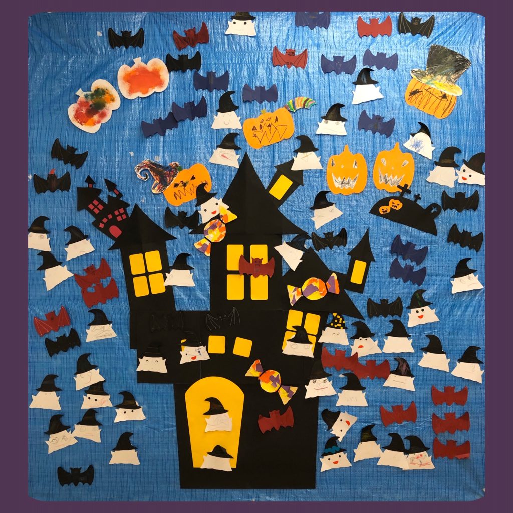 本八幡教室では、集団授業で作ったカボチャの周りに3種類のお菓子の工作でハロウィンの壁面工作をしました!