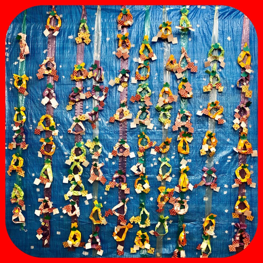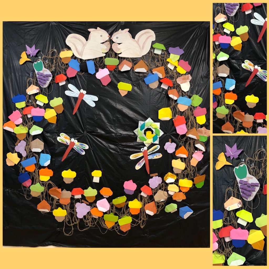 色とりどりの折り紙で折った作品で鮮やかなリースが出来あがりました。