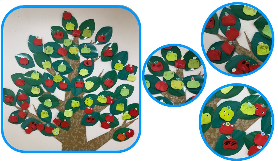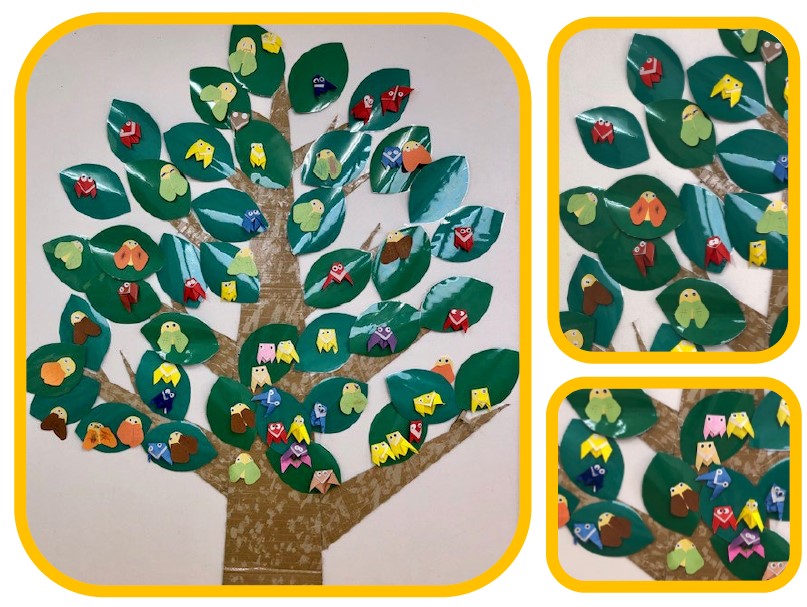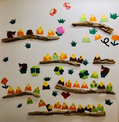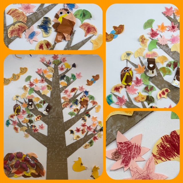 秋色に色付いた木を賑やかにしているのは、集団授業で作った、みのむし・リス・キツネ・鳥・サツマイモです