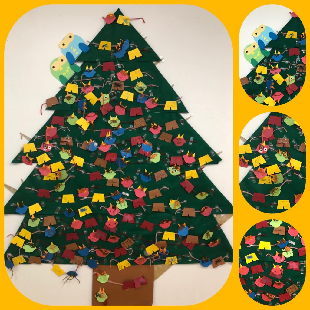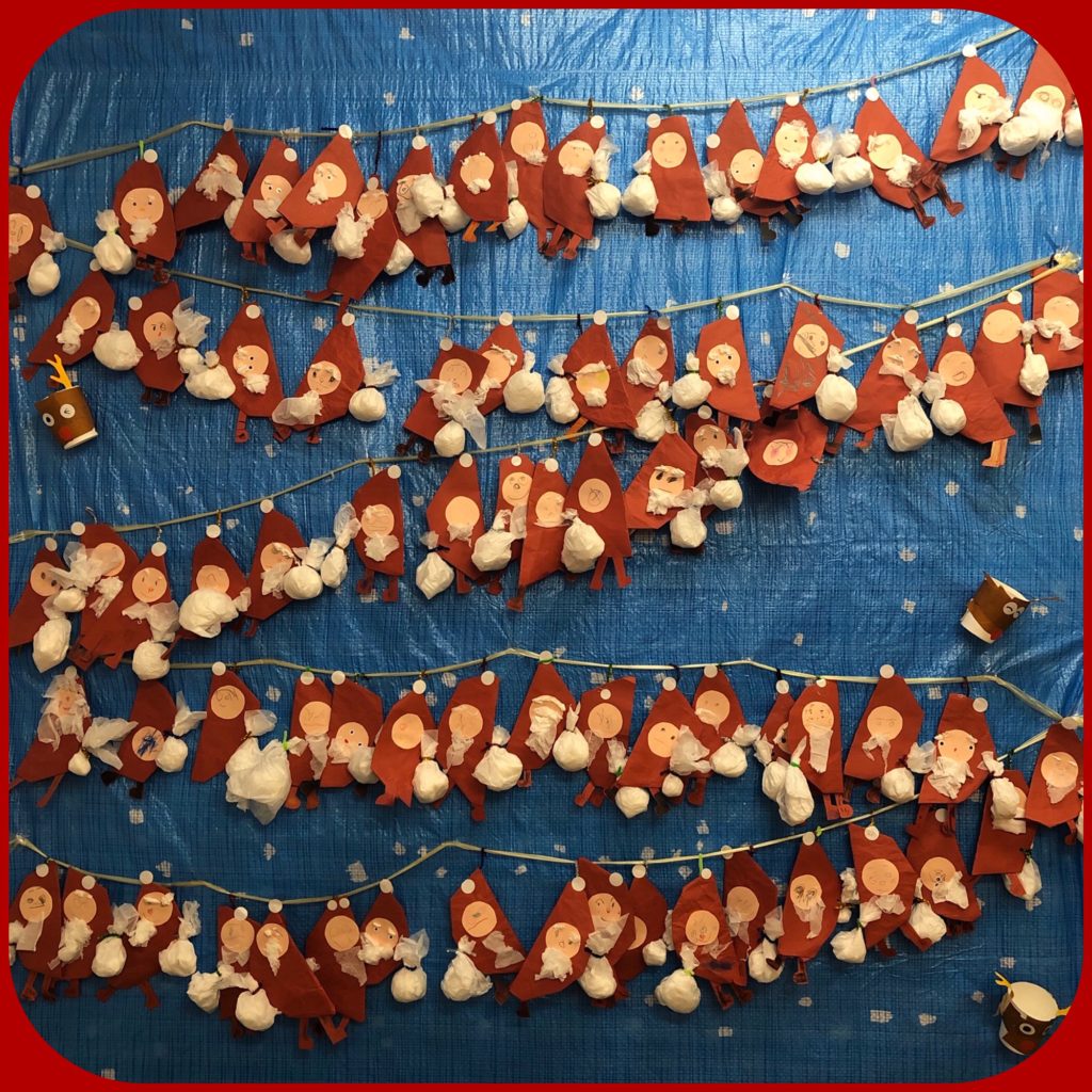その他、ツリーを飾っているのは、12月のイベントで作った丸いオーナメント、ペア集団で作ったポインセチアと銀色のオーナメント、年長集団で作った大きな星と輪飾りです![]()