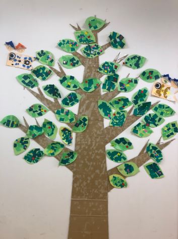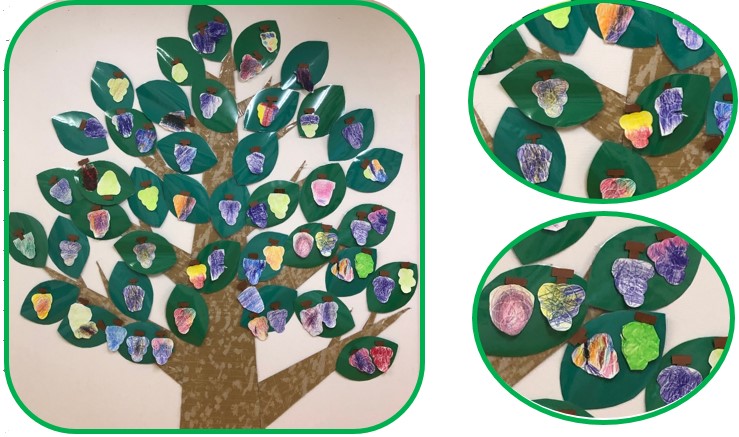 葉っぱの土台に貼り付ける時もバランスよく貼るように声かけをして、全体を見る力を育みます。