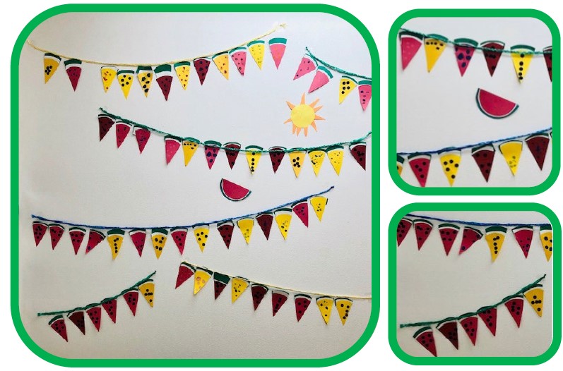 すいかの実と皮の3つのパーツを組み合わせて、三角のすいかを作ります。