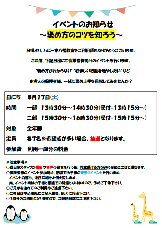 本八幡教室では、8月17日(土)13:30~保護者様向けイベントを行います!