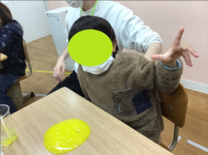 色んな色のスライムが出来上がり、各々感触を楽しんでいました。