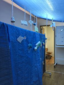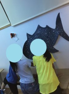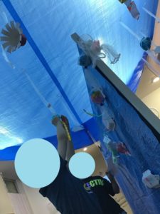 教室全体を水族館の水槽に見立てて、みんなそれぞれ思い思いに魚を作りました🐟