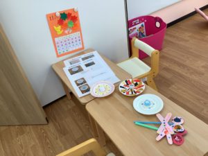 工作コーナーでは、コマやトンボ、季節のカレンダーが作れます🍄