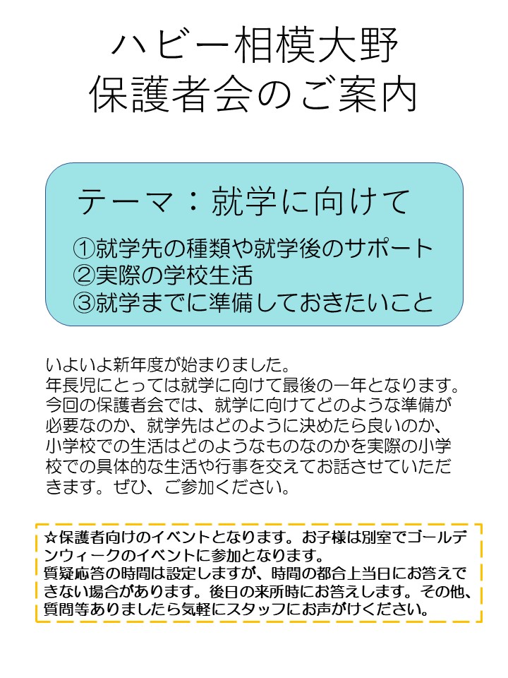 イベントの時間を使って年長の保護者向けに保護者会も行いました。