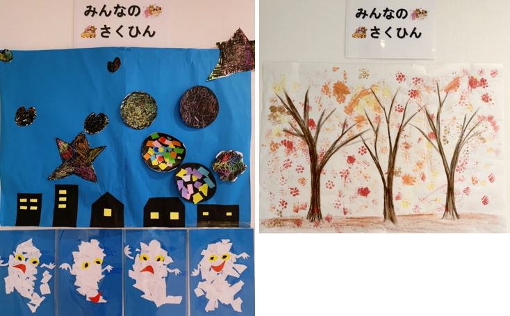 花火のスクラッチ、おばけのちぎり絵、葉っぱのスタンピング等の季節にちなんだ制作活動に取り組み、素敵な作品を作ることができました♪