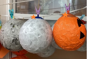 年長さんは、ハロウィンの置物 「貼りぼて」 の製作を二週連続で行いました。