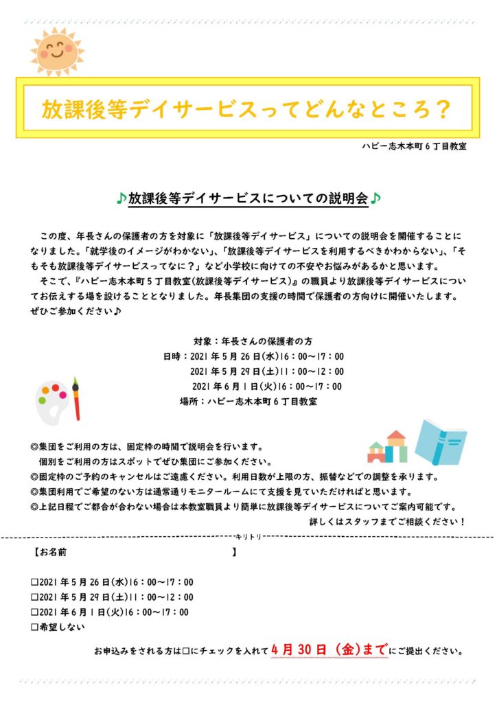 さて、今回は放課後等デイサービスについての説明会についてのお知らせです☆