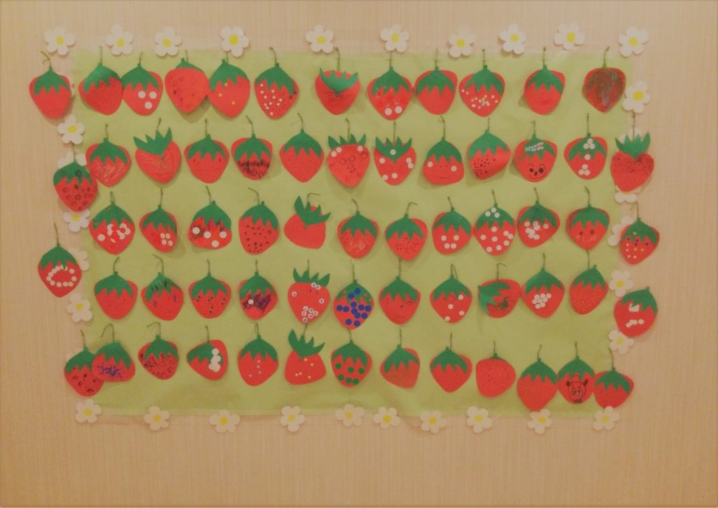 沢山のいちごが出来上がり、いちご畑のようなとてもかわいらしい壁面作品に今回もなりましたね~😊💕