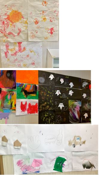 最初に、ハロウィンモチーフの作品です🍭おばけの折り紙にチャレンジしたり、アルファベットに挑戦する年長さんもたくさん見られ、素敵な壁画を作ってもらいました👻黒い画用紙にお絵描きする経験はあまりないので、子どもたちも「白は見えるかな?」など黒い画用紙ならではの疑問を抱きながらたくさん試して楽しく作品を作ることができています。経験のないことにどんどんチャレンジする姿に成長を感じますね❣