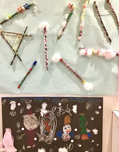 毛糸や綿を使いかわいく仕上げることができました。木の枝は身近ですが、作品の材料に使うと新鮮でおもしろいですね!