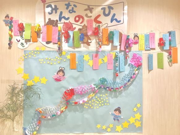 お子さまの願いや夢が詰まった短冊が保護者の方のご協力もあり集まっています。そして、スタッフも楽しく願い事を書かせていただきました![]()